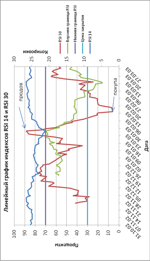 Линейные графики котировок, индексов RSI 14 и RSI 30 представлены на рисунке 5.1