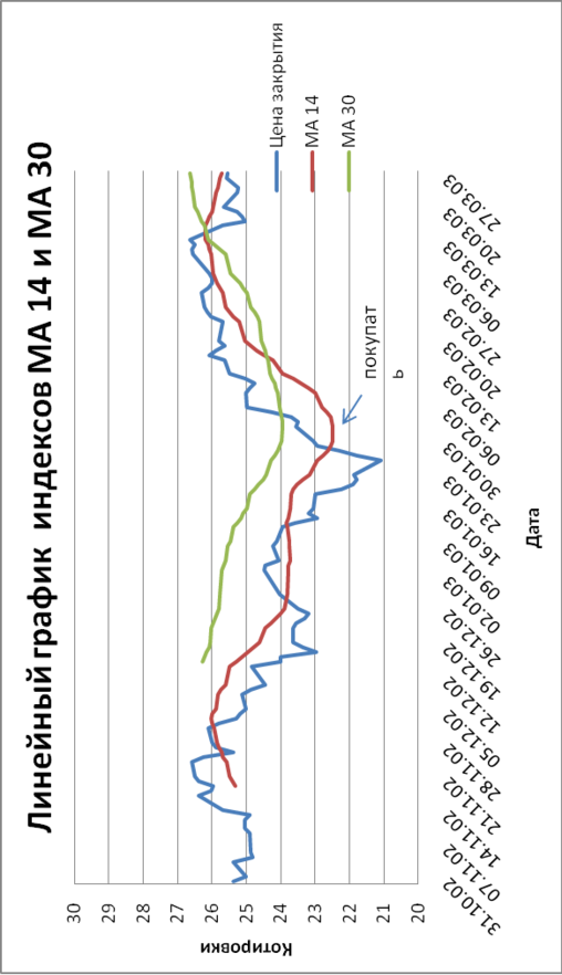 Линейные графики котировок, индексов МА 14 и МА 30 представлены на рисунке 5.2