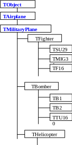 Наследование позволяет создавать иерархии классов, которые отражают связи понятий и явлений реальной предметной области. Рассмтриваемый пример показывает, что класс TAirplane, который инкапсулирует общие принципы поведения летательного аппарата как элемента системы управления воздушным движением, может рассматриваться как базовый при уточнении понятий «гражданский» и «военный». На рисунке 3.1 это TMilitaryPlane и TCivilPlane. Далее, мы развиваем ветвь военных самолетов, вводя такие уточнения как «истребитель» (TFighter), «бомбардировщик», (TBobmer),
