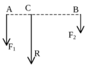 еория пар сил. Сложение двух параллельных сил: равнодейст-ющая двух парал-ых сил F1 и F2 одного направления имеет такое же направление, ее модуль равен сумме модулей слагаемых сил, а точка приложения делит отрезок между точками приложения сил на части обратно пропорциональные модулям сил: R=F1 + F2; АС/ВС=F2/F1. Равнодействующая двух противоположно направленных паралл-ных сил имеет направление силы большей по модулю и модуль, равный разности модулей сил.