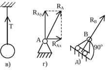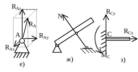 тавляющими; ж) невесомый стержень (обязательно невесомый) – реакция направлена вдоль стержня; з) "глухая" заделка (вмурованная балка) – возникает произвольно направленная реакция – сила и реактивный момент, также неизвестный по направлению. Реакция раскладывается на две составляющие.