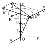 , модуль вращат. уск. авр=rsin, направлено по касательной к траектории точки, т.е. параллельно скорости. Центростремительное (осестремительное) ускорение