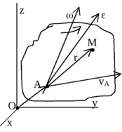 Ускорение точки св.тв.тела = геометрической сумме ускорения полюса, осестремительного ускорения точки и ее вращательного ускорения, определенных относительно мгновенной оси и оси углового ускорения, проходящих через полюс.