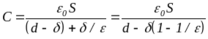 - диэлектрическая проницаемость воздуха, e - относительная диэлектрическая проницаемость изоляционного материала между пластинами, S - площадь пластин (электродов), d - расстояние между пластинами (электродами).