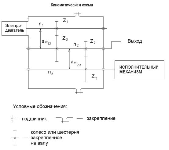 Выполним условное построение передаточного механизма. Принимаем, что вращательное движение передается на механизм с электродвигателя (Мощность на входе - Wвх=2000 вт.) и через него поступает на исполнительный механизм. Так же на второй оси предусмотрен выход вращательного движения (например - для измерительного приборов). Мощность на выходе W’вых=1000 вт.