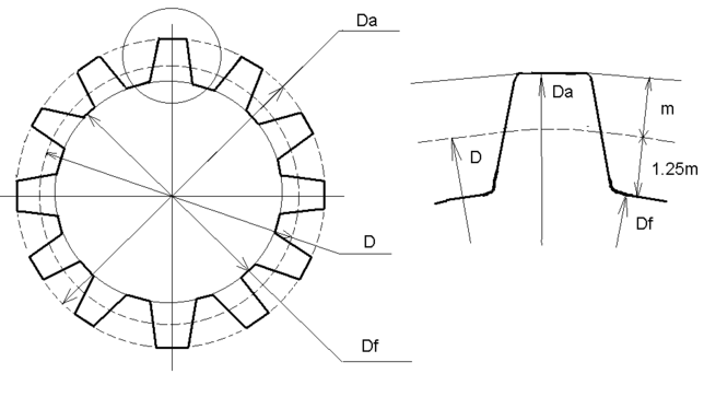 D=m*Z m =D/Z мм. – модуль, высота головки зуба hг.