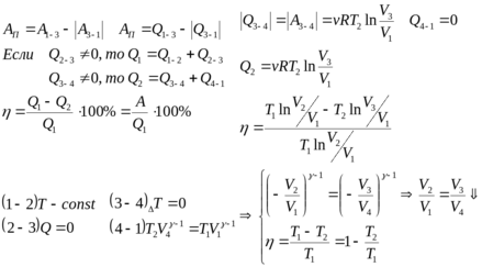 К.П.Д. цикла рассчитывается как отношение работы цикла к затраченному теплу. Или как отношение разности между затраченным и выделившимся теплом к затраченному теплу.