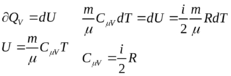 В одноатомном газе число степеней свободы равно трём, в двухатомном – (три поступательных и две вращательных – жёсткая гантель) равно пяти, в трёх и более – шести.