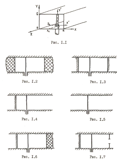 Решение задачи о возбуждении волновода и резонатора может быть построено на базе единой физической модели резонатора с полупрозрачными поперечными стенками (рис. 1.2), для которых известны коэффициенты отражения и прохождения собственных волн волновода (см. Приложение). Если положить коэффициенты отражения R=-1, т.е. считать, что поперечные стенки являются идеально проводящими, то данная модель трансформируется в прямоугольный резонатор (рас. 1.3). В том случае, когда коэффициент отражения одной из стенок считать равным нулю (R= 0), а второй R=-1, то рассматриваемая модель превращается в полубесконечный волновод, возбуждаемый ленточным зондом (рис. 1.4).