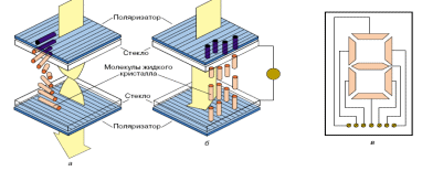 Рис. Схема работы ЖК- индикатора на твист – эффекте: (а) – до включения электрического поля, (б) – после включения поля, (в)-. Семисегментный буквенно – цифровой элемент.