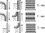 Особенностью метода Ленгмюра-Блоджетт является то, что сплошной упорядоченный мономолекулярный слой, предварительно формируется на поверхности субфазы и впоследствии переносится на поверхность подложки. Сформированный монослой, состоящий из плотноупакованных молекул АМФВ, переносится на движущуюся вниз-вверх через поверхность воды твердую подложку. В зависимости от типа поверхности подложки (гидрофильная или гидрофобная) и последовательности пересечения подложкой поверхности субфазы с монослоем и без монослоя, можно получать ПЛБ с симметричной (Y) или асимметричной (X, Z) структуры. Для получения однородной по толщине пленки Ленгмюра-Блоджетт, поверхность подложки должна иметь шероховатость Rz<=50нм.