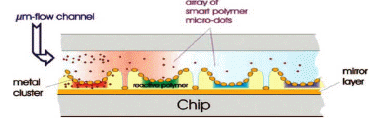 Диагностическая система «Лаборатория на чипе» (“Lab-on-chip”). Диагностическая система строится на основе матрицы (array) различных детекторов веществ. Мимо датчиков по каналу (flow channel) подается исследуемое вещество. При распознавании вещества параметры конкретного датчика изменяются. Сигналами отклика могут служить изменение сопротивления между электродами или цвета отраженного зеркалом (mirror) сигнала.