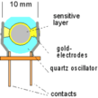 Резонатор может быть выполнен в виде консольной балки – кантилевера (cantilever) – из пьезоэлектрика Si. При длине балки 500 мкм резонансная частота составляет 50 КГц. Акустические колебания (вибрации) возбуждаются напыленными электродами с использованием прямого пьезоэффекта. Решетка балок с различными адсорбирующими покрытиями позволяет создать многопараметрический газоанализатор. Рис. Кварцевый резонатор с чувствительным покрытием.