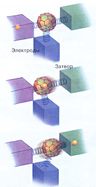 Фуллерен удерживается между электродами электрическими силами. Как только электрон попадает внутрь фуллерена, происходит смещение электрических сил. Молекула смещается к одному из электродов и сопротивление меняется. Электрон покидает фуллерен, и он смещается в исходное положение.