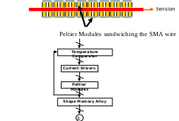 Для маломасштабных гибких (многосекционных) манипуляторов с помощью элементов Пельтье организуется дискретное управление. Каждая секция манипулятора - это отрезок проволоки из сплава с памятью формы (СПФ - SMA), которая при нагревании изгибается. Для нагревания каждого из отрезков используется свой модуль Пельтье. Подавая по программе напряжение на определенные модули в определенной последовательности, можно получить изгибающийся манипулятор. Это один из вариантов искусственной мышцы.