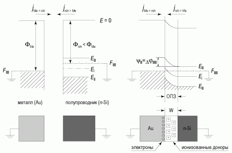 При контакте таких материалов в начальный момент времени ток из металла в полупроводник p-типа будет превышать обратный ток из полупроводника в металла, и в приповерхностных областях полупроводника и металла будут накапливаться объемные заряды - положительные в металле и отрицательные в полупроводнике.