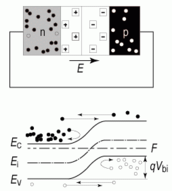При возникновении контакта двух полупроводников, в одном из которых высока концентрация дырок (p-тип), а в другом - свободных электронов (n-тип) вследствие теплового движения начинается диффузия основных носителей заряда из "родного" полупроводника в соседний, где концентрация таких частиц во много раз меньше. Дырки переходят из p-полупроводника в n-полупроводник, электроны - из n- в p-полупроводник.