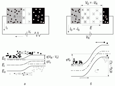 При прямом смещении, когда положительный потенциал подан на p-область, дырки устремляются навстречу электронам, которые, преодолевая пониженный потенциальный барьер в области pn-перехода попадают в p-область. При этом происходит рекомбинация электронов и дырок. Вследствие этого "чужие" носители заряда не проникают глубь полупроводников, погибая в области pn-перехода. Протекание тока при этом можно представить в виде двух потоков - электронов и дырок, которые втекают в область рекомбинации с противоположных сторон. С увеличением напряжения возрастают скорости втекающих электронов и дырок и, соответственно, скорость их рекомбинации.