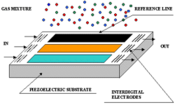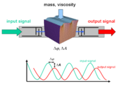 В структуру устройств на ПАВ входят два преобразователя: В отличие от объемных АВ, с ПАВ можно использовать планарную технологию и легко связываться в любом месте поверхности. В датчиках массы (mass), вязкости (viscosity) на поверхность звукопровода между преобразователями наносится исследуемое вещество. Параметры вещества определяются по изменению фазы и амплитуды выходного сигнала по отношению к входному.