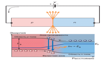 Рис. Схема и энергетическая диаграмма полупроводникового светодиода.