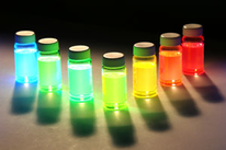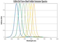 Рис. 3 . (А) – спектр излучения и (Б) цвета коллоидных растворов нанокристаллов полупроводника CdSe/ZnS с размерами взвешенных частиц от 490 – 620 нм.