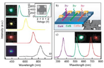 Рис. 8. Спектры излучения транзисторов на перекрестиях с различными полупроводниками: GaN – синий, CdS – зеленый, CdSe – красный.