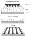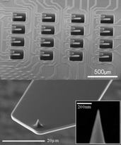 Зонд силового СТM можно выполнить в форме «плуга» (plow), который изготавливается из кремния с помощью литографии и анизотропного травления. Силовой СТМ способен испарять материал вблизи зонда. Как и в современном сельском хозяйстве, удобно использовать сразу несколько лемехов. Характерный размер острия составляет 30 нм, что и определяет ширину борозд. Процарапанные борозды на тонкой пленке резиста, нанесенного на поверхность кремния, были “дотравлены” с помощью реактивного ионного травления. В результате удалось сформировать структуру нитей кобальта толщиной 50нм.
