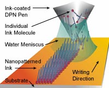 Возможна печать с помощью «наночернил» (nanoink), стекающих в водной среде (Water) с зонда СТМ (Ink-coated Pen) на подложку (Substrate).