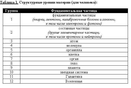 Несложно заменить, что не все структурные уровни, представленные на графике и в таблице, соответствуют каждой биологической форме. Так, к примеру, у растений и деревьев нет такого структурного образования, которое можно было бы назвать телом. А у бактерий нет того, что можно было бы назвать органом. Соответствие видов биологических форм фундаментальным частицам групп можно увидеть в таблице 2.