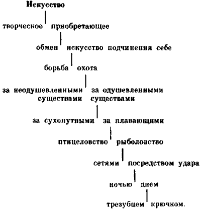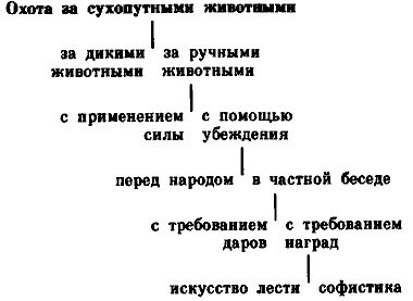 [6] Элеец в своем определении рыболова пользуется дихотомическим принципом. Весь правый столбец таблицы входит в определение ловли рыбы с помощью удочки. Таким образом, софист ловит людей, привлекая их ложной мудростью, как рыболов на крючок: