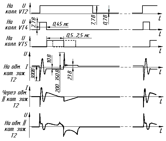 | Рис.3 Эти импульсы управляют работой усилителя тока (VT6) и коммутатора (VT7). В исходном состоянии транзистор VT5 открыт до насыщения током через резистор R16 и диод VD4, а транзисторы VT6 и VT7 закрыты. С появлением на коллекторе транзистора VT5 импульса зажигания конденсаторы С4 и С5 заряжаются через диод VD3 — первый через резистор R14, а второй — через резистор R13, диод VD4, эмиттерный переход транзистора VT5 и резистор R21. По окончании импульса зажигания напряжение на конденсаторе С4 закрывает диод VDЗ, а разностное напряжение встречно включенных конденсаторов С4 и С5 диод VD4. Транзистор VT5 тоже закрывается, так как напряжение на его базе станет равным нулю. После этого конденсатор С4 разряжается через резистор R15, а конденсатор С5 — по цепи R13—R15, источник питания и резистор R16 до тех пор, пока разностное напряжение на этих конденсаторах не уменьшится до порога открывания диода VD4 и транзистора VT5. | ||||||||||||||||||||||