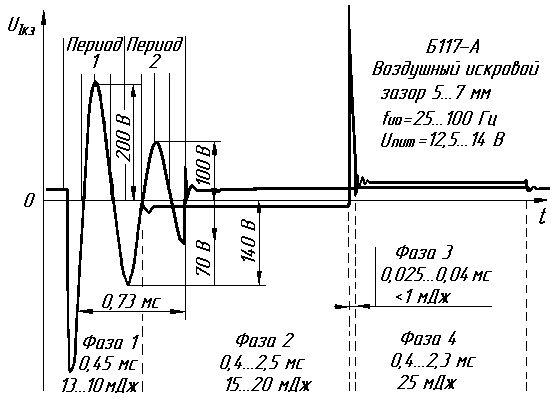 | С увеличением первичного тока увеличивается и запасаемая в катушке электромагнитная, энергия. После окончания импульса на выходе одновибратора транзисторы VT6 и VT7 закрываются. Из-за большой скорости изменения тока на коллекторе коммутатора VT7 возникают несколько коротких импульсов с большой амплитудой. Конденсатор С6 и резистор R22, являющиеся элементами цепи отрицательной ОС по напряжению, сглаживают и ограничивают их на уровне 200...350 В при длительности соответственно 40...25 мкс. После закрывания коммутатора вследствие явления самоиндукции на обмотках катушки зажигания изменяется полярность напряжения, а искровой разряд продолжается за счет запасенной в катушке энергии. Так по каждому импульсу зажигания формируются два, следующих один за другим, искровых разряда. Первый начинается с высоковольтного импульса и колебаний в катушке зажигания за счет энергии разряжающегося накопительного конденсатора тиристорной системы (первая фаза) и затем поддерживается при открытом коммутаторе (вторая фаза). На рис. 6 изображена диаграмма напряжения на первичной обмотке катушки зажигания во время Рис.6 | ||||||||||||||||||||||