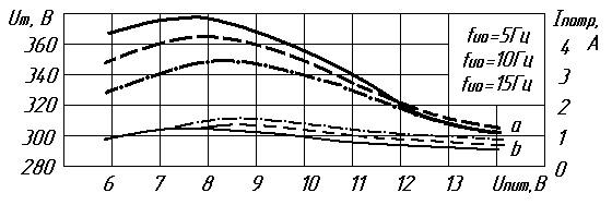 | Остальные кривые иллюстрируют характер изменения зависимостей при изменении номиналов некоторых элементов. Штриховыми линиями изображены характеристики блока при С10=0,47 мкФ, R13=470 Ом, R14=110 Ом, R15=7,5 кОм, штрихпунктирными — при тех же условиях, кроме R15=11 кОм. Линия a штрихпунктирная и линия b штриховая линии совпадают с соответствующими сплошными линиями. (Uбс — напряжение бортовой сети). Рис.4 То обстоятельство, что резистор R23 ограничивает мощность преобразователя, т. е. фактически конечное напряжение на конденсаторе С8, до которого он успевает зарядиться перед очередным циклом разрядки, использована для построения зависимости (кривые a на рис. 4). Если необходимо обеспечить амплитуду начального импульса тиристорной системы равной 300В до частоты 180...200 Гц, сопротивление резистора R23 следует уменьшить до 3...5 Ом. Включением диодов VD10 — VD13 и конденсатора С9 значительно усилено увеличение выходного напряжения при уменьшении напряжения питания. Данному блоку не опасны замыкания: в цепях выходных обмоток I и IV трансформатора Т1, т.к. диоды VD6 и VD8 проводят ток в промежутки времени, когда транзистор VТ8 закрыт. | ||||||||||||||||||||||