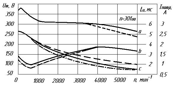 | В процессе разрядки конденсатора С5 напряжение на конденсаторе С4 уменьшается незначительно, так как его постоянная времени разрядки во много раз больше, чем у С5. И поскольку длительность и амплитуда импульсов зажигания постоянны, оно тем больше, чем выше частота искрообразования. Следовательно, с увеличением частоты уменьшается начальное значение разностного напряжения на этих конденсаторах, которое удерживает диод VD4 и транзистор VT5 в закрытом состоянии, и сокращается время разрядки конденсатора С5 до их открывания. Другими словами, с увеличением частоты увеличивается напряжение на конденсаторе С4, а оно уменьшает начальное напряжение и, стало быть, время разрядки конденсатора C5. Таким образом, на коллекторе транзистора VТ5 формируется положительный импульс, фронт которого совпадает со спадом импульса зажигания, а длительность является обратной функцией частоты искрообразования (см. диаграмму напряжения на коллекторе транзистора VТ5, рис. 3). В течение этого импульса транзисторы VT6 и VT7 открыты. Диод VD4 и резистор R17 предотвращают возможность пробоя эмиттерного перехода транзистора VТ5 напряжением на заряженном конденсаторе С5. Накопительный конденсатор С8 тиристорной системы и демпферный конденсатор С7 узла вольтодобавки заряжаются от однотактного преобразователя напряжения, в состав которого входят транзистор VТ8, трансформатор Т1, диоды VD10 — VD16, конденсатор С10 и резисторы R23 и R24. В преобразователе с непринципиальными изменениями использована схема блокинг-генератора. Для расширения рабочего интервала температуры германиевый транзистор заменен кремниевым. В связи с этим для надежного возбуждения колебании после каждого цикла разрядки конденсатора С8 введен диод VD16 и изменено соотношение чисел , витков обмоток трансформатора. Графическая зависимость амплитуды напряжения UM на обмотке1 катушки зажигания Т2, а также длительности искры и потребляемого тока Iпотр. от частоты вращения n коленчатого вала двигателя показаны сплошными линиями (рис. 4). | ||||||||||||||||||||||