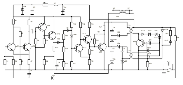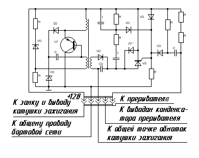 | Введение Система зажигания служит для воспламенения рабочей смеси в цилиндрах двигателя в строго определённые моменты времени. Воспламенение смеси может быть осуществлено с помощью батарейной системы зажигания. По способу прерывания тока первичной цепи батарейные системы подразделяются на контактные, контактно-транзисторные и бесконтактные. Описываемое устройство является контактно-транзисторным, и предназначено для работы в автомобилях со старой электромеханической системой зажигания, то есть имеющей в своём составе катушку зажигания, контактный прерыватель, распределитель, регулятор опережения зажигания, и так далее. Например, на модели ВАЗ от 2101 до 2107. По типу блок относится к классу комбинированных. Он представляет собой сочетание тиристорной схемы с непрерывным накоплением энергии от однотактного блокинг-генератора, и транзисторной с узлом добавки напряжения. Система предназначена для работы с высокоомной катушкой зажигания, у которой у которой сопротивление первичной обмотки 2…4 Ом | ||||||||||||||||||||||