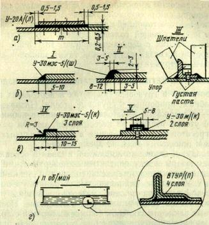 а — укладка ленты; б — нанесение пасты шпателем; я — нанесение герметика кистью;