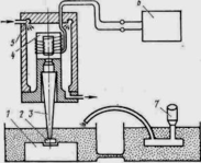 Ультразвуковой метод обработки применяется для изготовления деталей из любых твердых и хрупких материалов — бронестекла, керамики, твердых сплавов и др. Этот метод обработки (рис.5.) основан на выкрашивании твердых и хрупких материалов при импульсном вдавливании в них абразива. Абразивные частицы выдалбливают в материале углубление по форме сечения торца инструмента, колеблющегося с амплитудой 0,02 ... 0,06 мм и большим ускорением. Кроме колебательного движения инструмент получает поступательную подачу с небольшим нажимом — 0,2 ... 0,5 МПа (2 ... 5 кгс/см2) на обрабатываемый материал. Точность обработки 0,01 ... 0,02 мм, шероховатость поверхности — 9-й класс.