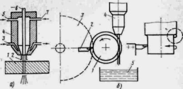 2 — резец; 3 — абразивный круг; 4 — плазменная горелка; 5 — ванна с водой