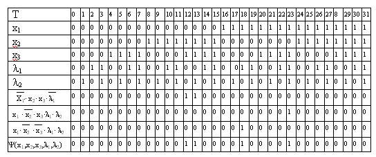 Сокращенный базис есть множество (n+m) разрядных наборов ‚ при которых удовлетворяется условие (3.1), то есть множество наборов (х1‚ х2‚...‚ хn‚ 1‚ 2‚...‚ m) на которых функция ( ) равна единице (множество T1 функции ). Сокращенный базис для заданной функции может быть представлен в виде‚ например‚ специальной таблицы (см. таблицу 3.1).