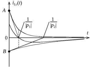 Цепи с такими СЧ принято называть апериодическими, поскольку свободное решение в этом случае представляет собой сумму двух затухающих экспонент (см. рис. 4.2)