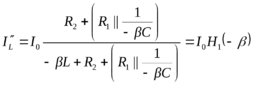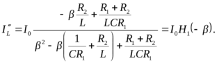 Физическая трактовка этой довольно сложной формулы заключается в следующем. Амплитуду вынужденной реакции можно найти по схеме цепи, если индуктивность заменить операторным сопротивлением pL при p = –, а емкость – операторным сопротивлением 1/рС также при p = – (см. рис. 4.11), считая источник тока i(t) постоянным и равным амплитуде экспоненты I0. Воспользовавшись уравнением делителя тока и проведя эквивалентные преобразования сопротивлений, получим выражение