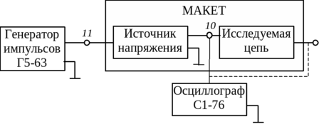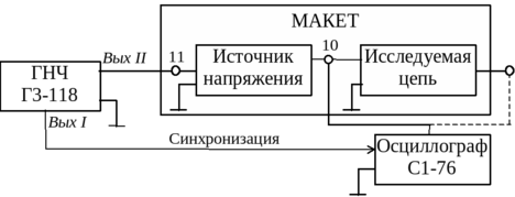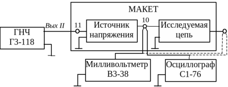 На рис. 7.1 приведены элементы, смонтированные на плате лабораторного макета, указаны номера клемм, к которым следует подключать источник сигнала, измерительные приборы и проводники, осуществляющие заземление. Вставьте плату в разъем универсального лабораторного источника питания (лабораторного столика), включите источник питания и соберите схему рис. 7.3. Исследуемая цепь представляет собой одну из схем, приведенных на рис. 7.2 (конкретную схему для вашего исследования вам укажет преподаватель).