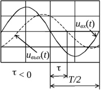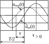 Соберите схему рис. 7.4, предназначенную для измерения ФЧХ. Осциллограф включается в режим внешней синхронизации. Косвенное измерение фазового сдвига между выходным и входным сигналами основывается на прямом измерении временного сдвига. Осциллограф поочередно включается на вход и выход исследуемой цепи. Установите характерную точку входного сигнала (переход через нуль) в центре экрана. Измеряйте смещение этой точки у выходного сигнала. Измеряйте также период сигнала. Для ускорения измерений временной сдвиг и период рекомендуется определять в делениях сетки, нанесенной на экран осциллографа. Частоты устанавливайте те же, что и при измерении АЧХ. При увеличении частоты изменяйте скорость развертки (масштаб по оси времени), чтобы на экране укладывалось не более одного периода сигнала, иначе измерения временного сдвига будут очень неточными. Условно будем считать временной сдвиг положительным ( > 0), если выходной сигнал опережает по фазе входной (сдвигается влево). В случае запаздывания выходного сигнала (сдвиг вправо) временной сдвиг считается отрицательным ( < 0) (см. рис. 7.5).