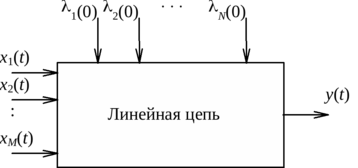 Под анализом радиоэлектронной цепи понимается определение реакции y(t) цепи при заданном воздействии {x1(t), x2(t), …, xМ(t)}, структуре цепи и ее начальном состоянии {1(0), 2(0), N(0)} (рис. 1.1).
