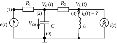 Воздействиями являются источник напряжения e(t) и источник тока i(t), а искомой реакцией – ток через индуктивность iL(t). Задано также начальное состояние: напряжение на емкости VC0 и ток через индуктивность