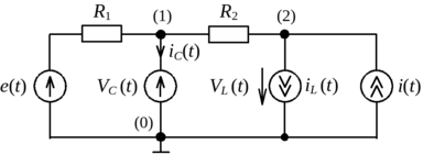 Выбираем узловые напряжения. Из трех оставшихся узлов только два могут быть выбраны для обозначения узловых напряжений. Это узлы «2» и «3», напряжения на которых относительно опорного узла обозначены VC(t) и VL(t) соответственно. Напряжение узла «1» не обозначается в качестве узлового напряжения, поскольку оно известно и равно e(t).