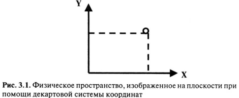 В физическом пространстве, которое условно можно изобразить на плоскости при помощи декартовой системы координат, любое событие или вещь можно выразить абстрактной точкой, из которой на ось OY и ось ОХ можно опустить перпендикуляр (рис. 3.1).
