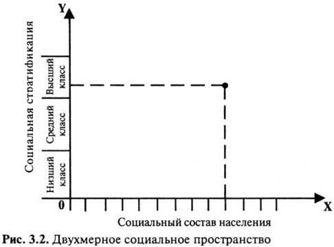 В свое время Вебер, как позже и Сорокин, рассматривал общественную диспозицию в трехмерном социальном пространстве, возникающем на базе иерархических структур отношений собственности, власти и престижа. Однако ни Вебер, ни Сорокин никогда не изображали свои модели наглядным образом – при помощи декартовой системы координат на листе бумаги. Они оставили только словесное описание своего видения стратификации и социального пространства.