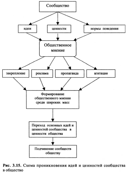 Для того чтобы ценности сообщества стали ценностями общества, они должны прежде всего закрепиться в сознании основной массы населения, а уже затем, твердо убежденные в своих идеалах и целях люди занимаются пропагандой своих убеждений среди оставшейся «неверующей» части людей (рис. 3.15). Важнейшим фактором формирования общественного мнения являются СМИ.