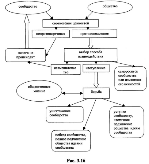 Таким образом, в механизме проникновения идей и ценностей сообщества в большое общество и подчинение этими идеями общества центральную роль играет отношение к власти и к общественному мнению. Сообщество может влиять на власть как непосредственно, так и опосредованно, через общественное мнение. Однако если власть захвачена неким сообществом без опоры на общественное мнение, то при проведении политики насаждения чуждых ценностей и идеалов, общество свергнет такую власть путем поддержки такого сообщества, которое бы отвечало интересам этого общества, то есть механизм запускается заново.